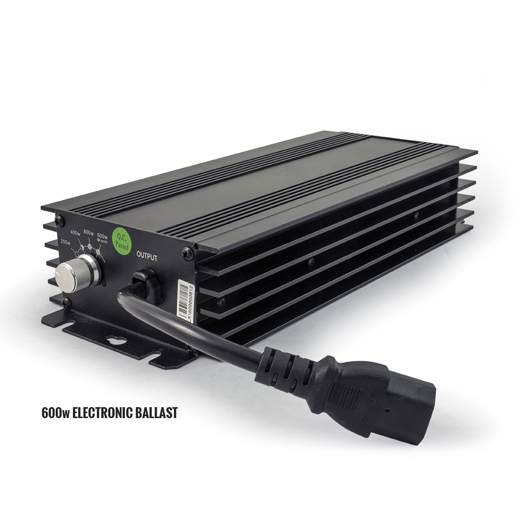 The 600w Electronic Ballast is supplied as a stand-alone ballast with a flying IEC lead so you can add any reflector fitted with an IEC socket to start growing.The ballast features both dim and boost functions, having the ability to control the light output from the lamp. There are two dimmable options (250w & 400w) and a ‘super-lumens’ boost option (600w+Boost) which is on average an extra 10% increase in output.For best results, always use the correct lamp per wattage setting.