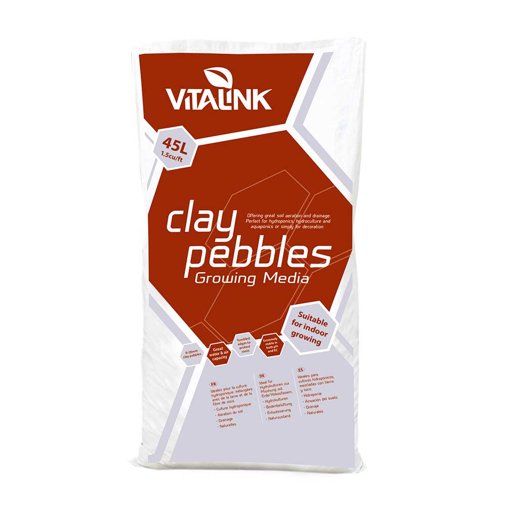 VitaLink Clay Pebbles are 8-20mm clay pellets that have a lower bulk density meaning they are lighter which leads to higher porosity and therefore more water retention. These pebbles offer a tumbled surface without sharp edges that can cut delicate roots and harm plants making them vulnerable to pests and diseases. They ensure good aeration (non-compaction) and are extremely stable in both pH and EC and help prevent excess acidity build up. The VitaLink Clay Pebbles perform excellently in Flood and Drain systems where oxygen exchange in thick root mass is essential. Their strong structural integrity means that they are less likely to break and compact which can cause blocked dripper systems. These clay pebbles are pre-washed to aid in stability. The pebbles drain freely and do not hold any excessive water and this is why they provide good oxygen levels around the root and why they are well suited for Flood and Drain systems. They are also used extensively for Multi pot systems and drip fed WaterFarm type systems.